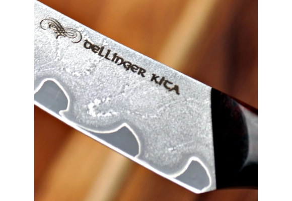 Noże Kita Dellinger North Damaskus wykonano w stylu północnoceltyckim z siedmiu warstw damastu. Rdzeń ze stali 10Cr15CoMoV jest laminowany sześcioma warstwami nieco miększej stali nierdzewnej. Stal 10Cr15CoMoV hartowana do twardości 62º w skali Rockwella jest wyjątkowo trwała i doskonale zachowuje krawędź, jej parametry są zbliżone do legendarnej japońskiej stali VG-10. Oryginalny damasceński mazerunek surfe przypominający wzburzone morze czyni każdy nóż niepowtarzalnym, a jednocześnie minimalizuje tarcie podczas cięcia i zapobiega przywieraniu ciętego materiału do ostrza.