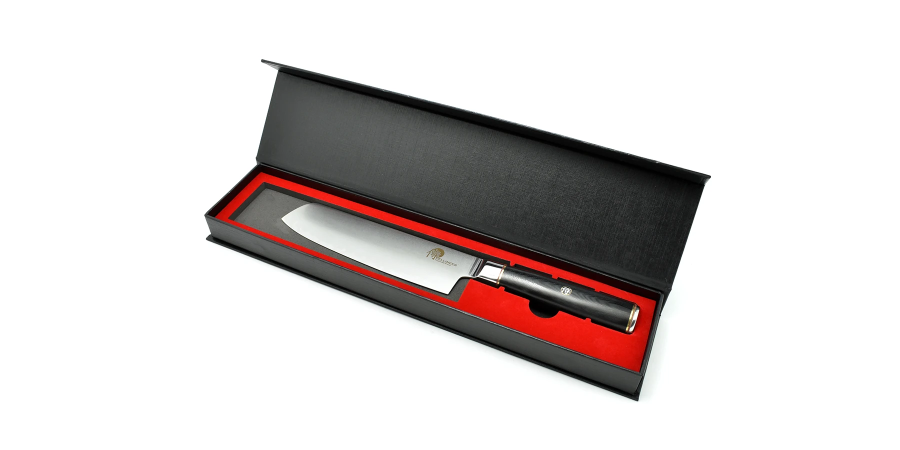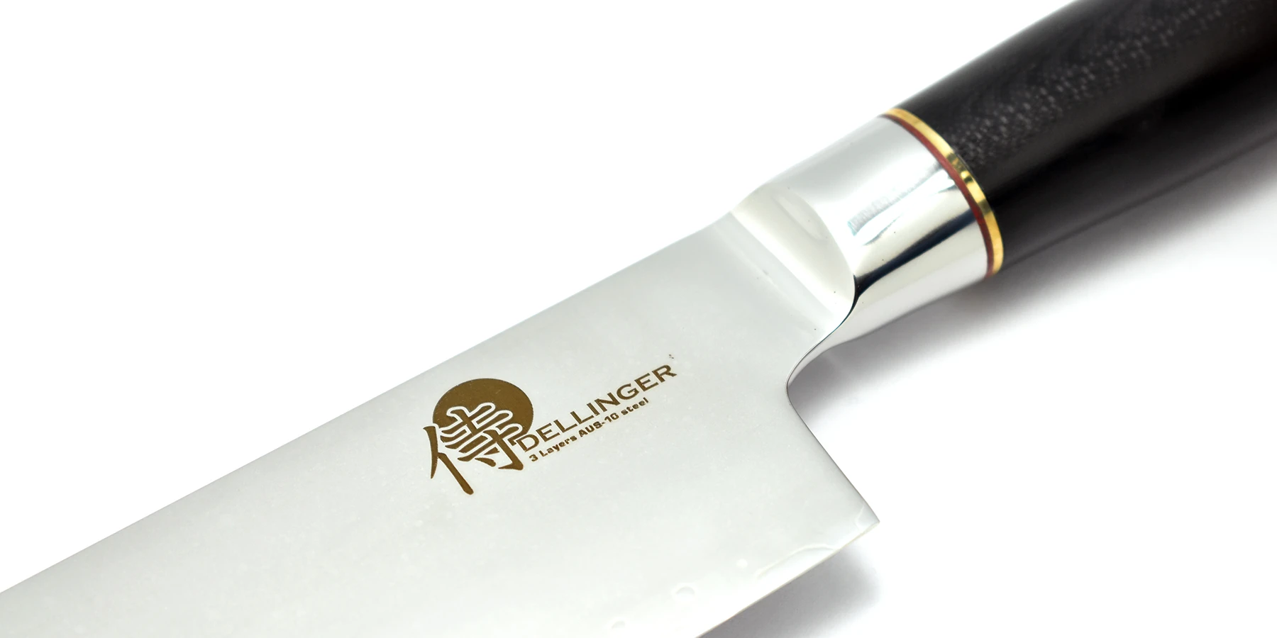 Rękojeść noża wykonano z podobnego do Micarty laminatu G-10. Jest to kompozytowy materiał z włókna szklanego spojonego żywicą epoksydową pod działaniem ciśnienia i wysokiej temperatury. G-10 ma wysoką wytrzymałość, niską absorpcję wilgoci oraz wysoki poziom odporności chemicznej. Uchwyt jest bardzo wygodny przez co nóż doskonale leży w dłoni. Unikalny wygląd zapewniają czerwone i złote pierścienie na obu końcach i centralny nit mozaikowy z logo Dellinger.