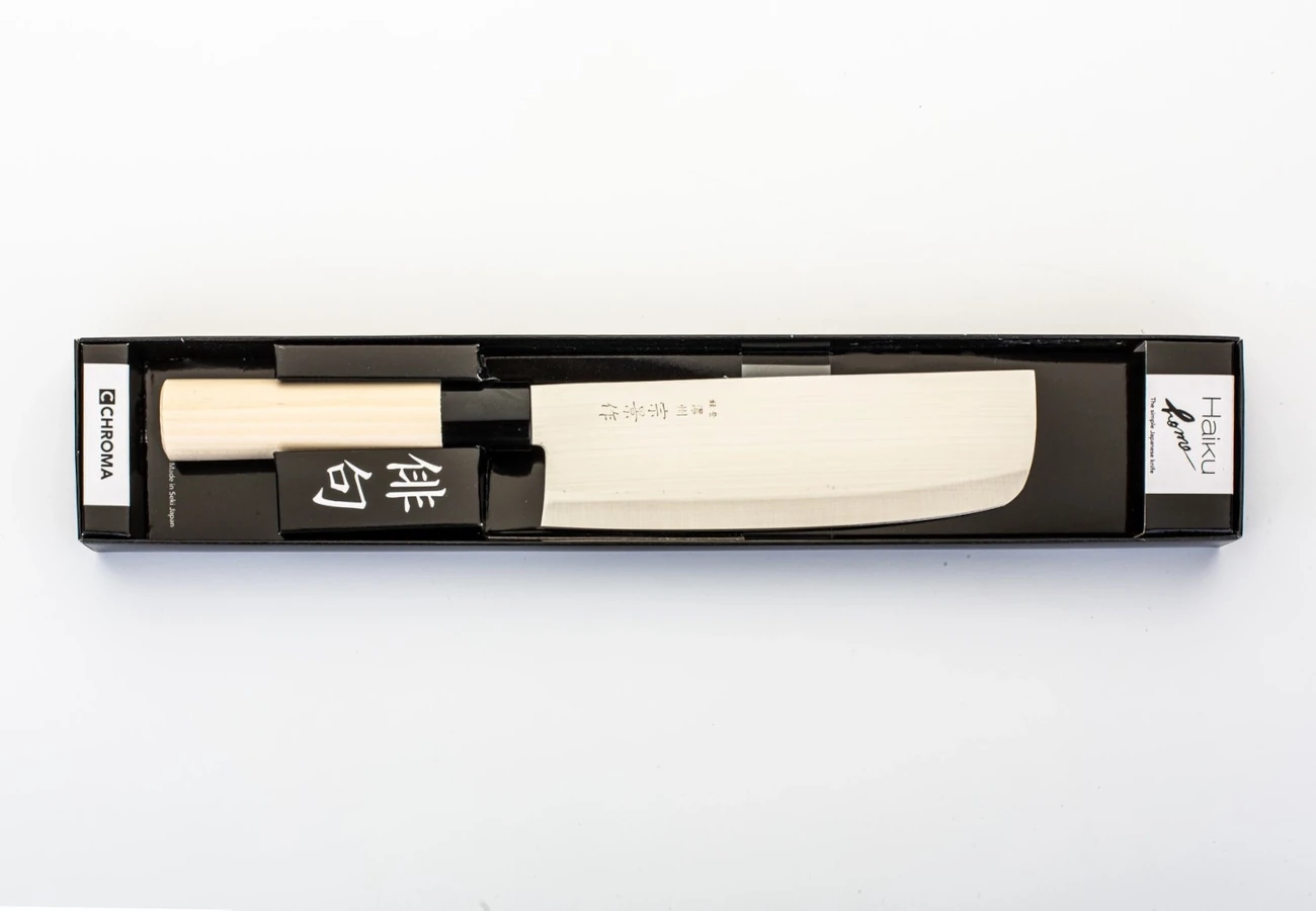 Haiku Home to prawdopodobnie najlepiej sprzedająca się linia popularnych noży japońskiej firmy Chroma. To niedrogie noże wysokiej jakości zaprojektowane z myślą o okazyjnym kucharzu lub napiętym budżecie. To świetne noże dla początkujących. Nierdzewna stal o twardości 56 (+/-1) HRC długo utrzymuje ostrość i jest łatwa w konserwacji i utrzymaniu. Drewniana rękojeść zakończona plastikową skuwką pozwala na pewny uchwyt nawet w kontakcie z wodą.