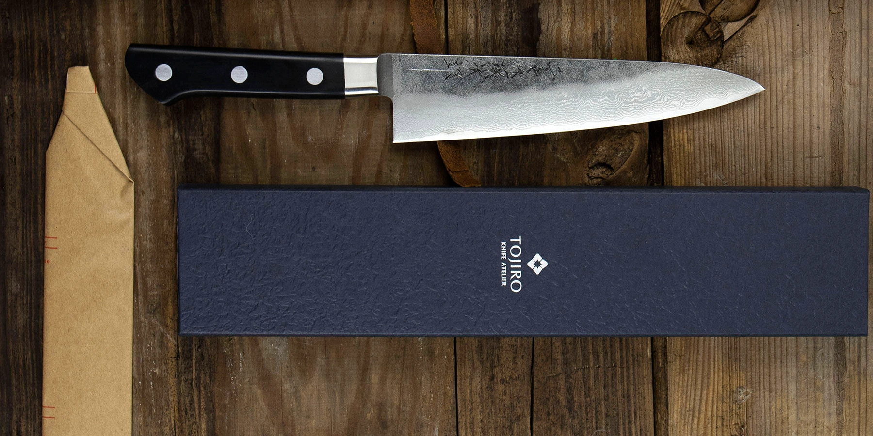 Nóż z laminowanej stali w konstrukcji full tang. Rdzeń ze stali VG-10 hartowanej do 61º w skali Rockwella otaczają 62 warstwy miększej stali nierdzewnej naprzemiennie o większej i mniejszej twardości co tworzy na powierzchni ostrza piękny damasceński mazerunek. Stal VG-10 wzbogacona chromem i wanadem zapewnia odporność na korozję i długotrwałą ostrość. Noże Tojiro Atelier Classic są ręcznie kute w Japonii przez przez mistrza Tomoo Matsumura. Dzięki temu każda klinga nabiera unikalnego wyglądu, a subtelne różnice w linii damasceńskiego wzoru sprawiają, że nie ma dwóch identycznych noży. Klinga w górnej części nie jest szlifowana, a na surowej powierzchni stali wytłoczono ozdobne kanji. To właśnie dzięki tej ręcznej pracy noże Atelier łączą rzemieślniczy charakter z precyzją i ostrością, których oczekują profesjonaliści na całym świecie.