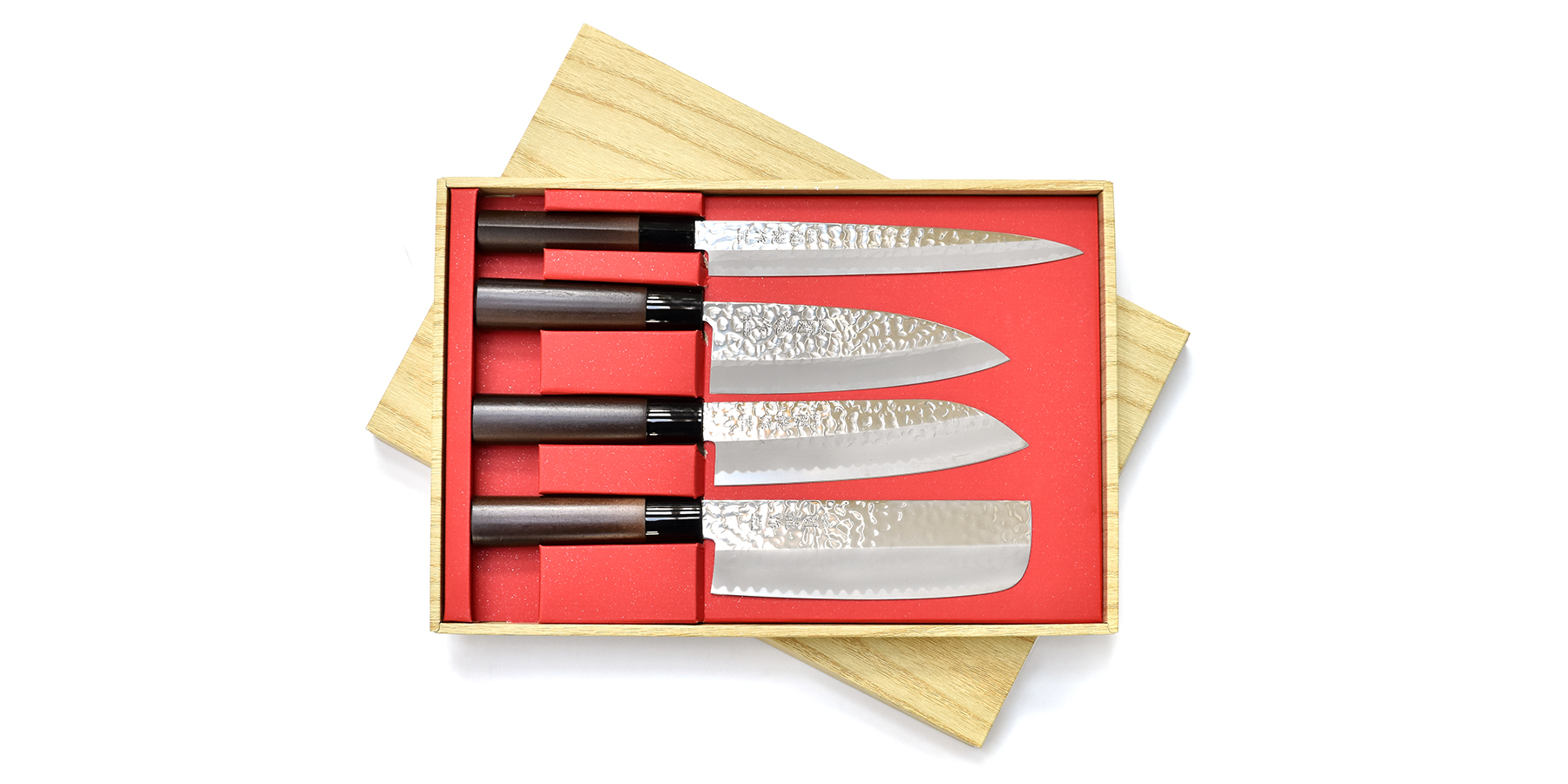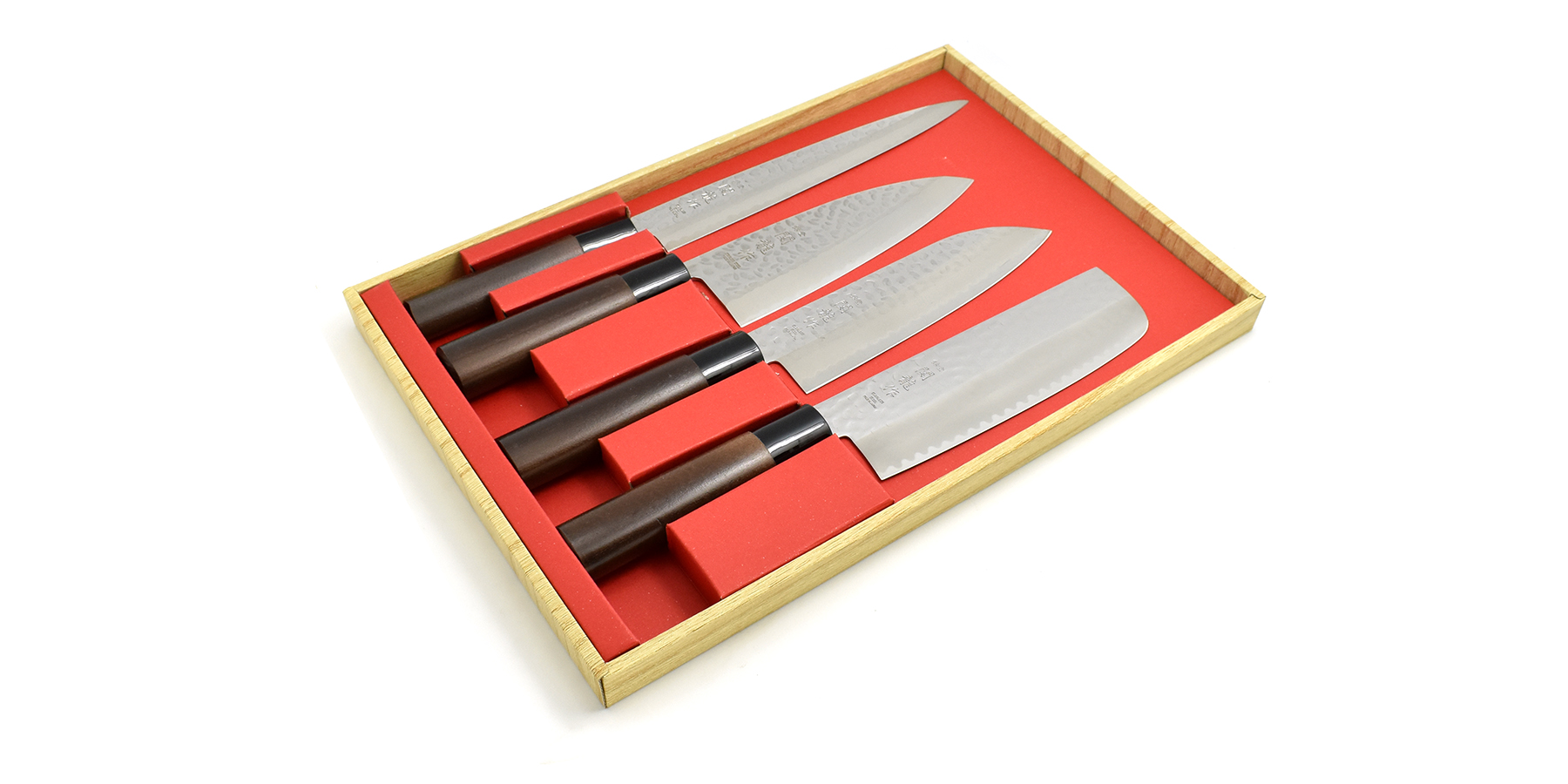 Komplet czterech japońskich noży kuchennych: Yanagi-Sashimi, Santoku, Nakiri, Deba.