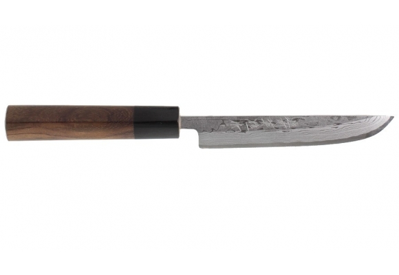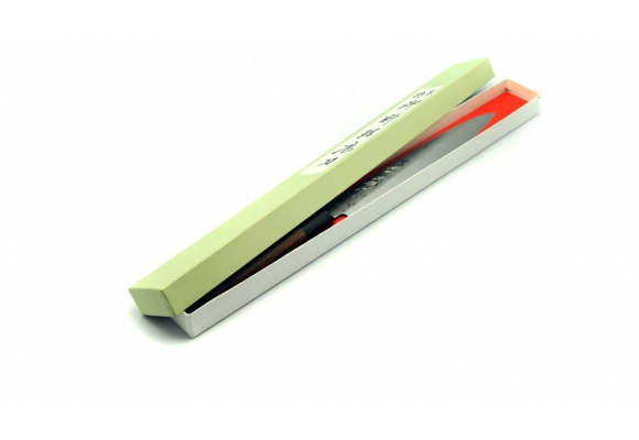 Ostrze noża wykonane jest z 12 warstw damastu kutych na rdzeniu ze stali Shirogami (White Paper Steel). Niezwykle czysta stal Shirogami, hartowana do 63° w skali Rockwella bez oznak kruchości, daje niebywałą ostrość i długie trzymanie krawędzi. Wielowarstwowa konstrukcja zapewnia elastyczność ostrza i ułatwia jego ponowne naostrzenie. Piękny damasceński wzór 12 warstw uzupełnia ręcznie trawione kanji w części grzbietowej ostrza. Nóż wyposażony jest w tradycyjny japoński uchwyt o przekroju w kształcie litery D wykonany z drewna drzewa sandałowego i zakończony skuwką z rogu bawołu.