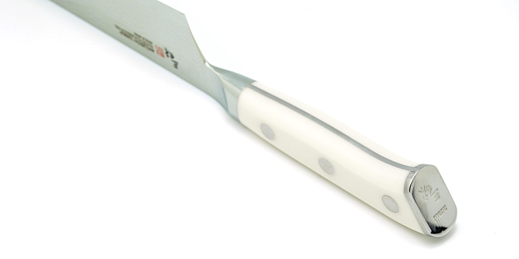 Ergonomicznie ukształtowany uchwyt w stylu zachodnim wykonany jest z Corianu. Corian to materiał kompozytowy z polimeru akrylowego i trójwodzianu tlenku glinu, minerału występującego naturalnie w przyrodzie. To niezwykle mocny materiał odporny na uderzenia i temperaturę. Rękojeść z białego Corianu ma skromny, lecz wyrafinowany czysty wygląd i delikatną, gładką fakturę. Całość prezentuje się niezwykle pięknie jak swoiste dzieło sztuki. Jakość noża musi docenić każdy, zarówno profesjonalista jak i amator.