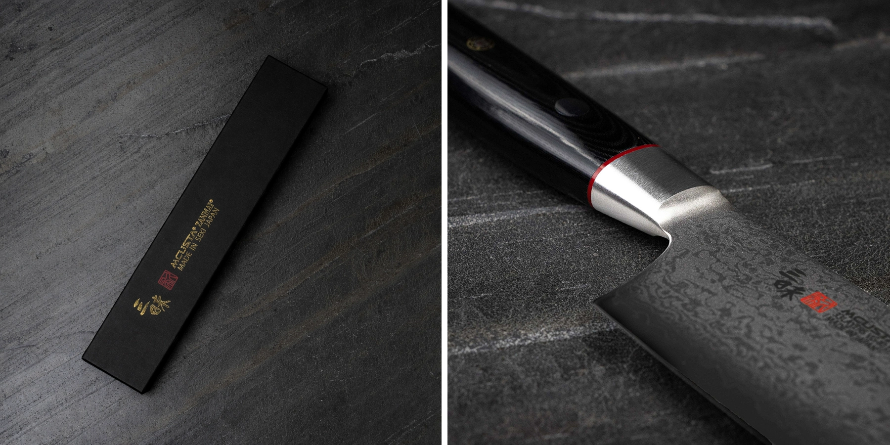 Ergonomiczna rękojeść w wersji „Pro Zebra” nadaje nożowi elegancki, nowoczesny wygląd, a jednocześnie zapewnia pewny i komfortowy chwyt nawet podczas intensywnej pracy w kuchni. Wykonane z micarty okładziny mocowane są do trzpienia trzema nitami z środkowym ozdobnym nitem mozaikowym. Micarta to niezwykle trwały materiał wykonany z lnu i syntetycznej żywicy poddanych działaniu wysokiego ciśnienia i temperatury.