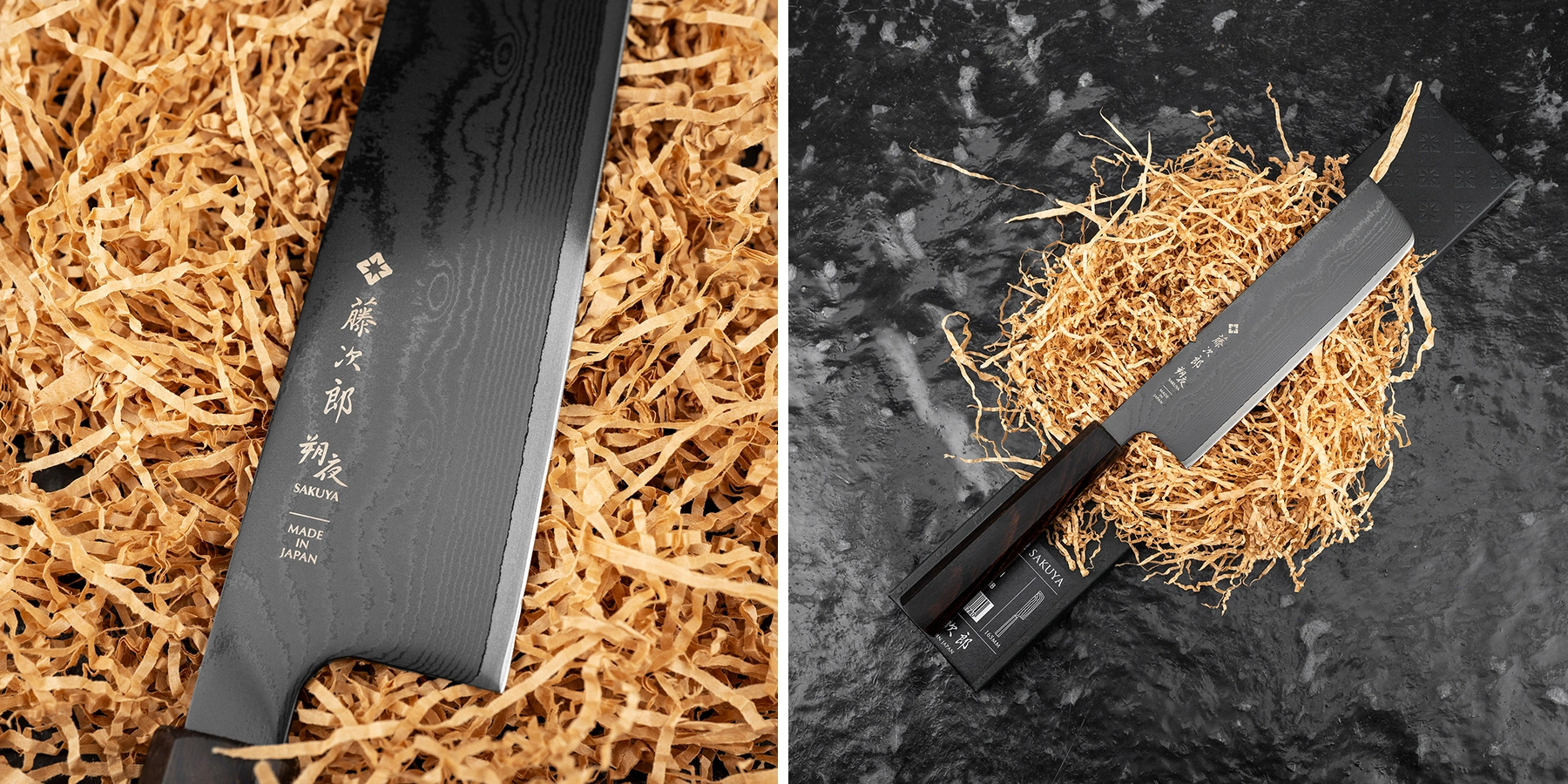 Seria Sakuya Black wyróżnia się charakterystycznym, czarnym ostrzem damasceńskim. Widoczny wzór warstw stali układa się w subtelne, falujące linie, a głęboka, czarna kolorystyka nadaje nożowi nowoczesnej elegancji i wyjątkowego stylu, który trudno pomylić z jakimkolwiek innym.